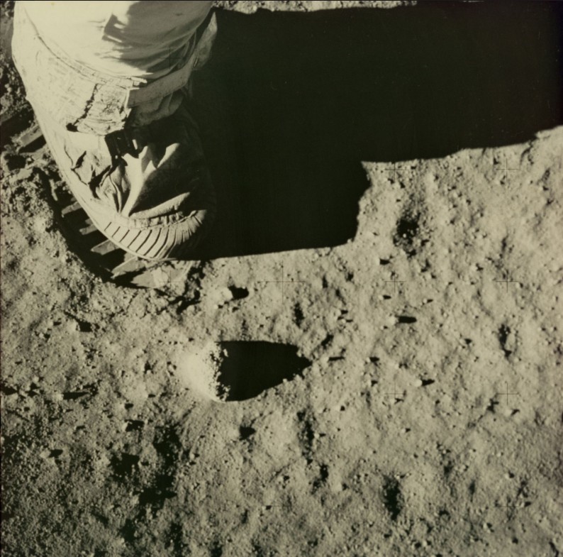 De gauche à droite Armstrong, Collins et Aldrin.Apollo 11: L’astronaute Edwin E. Aldrin, pilote de module lunaire de la première expédition d’atterrissage sur la lune, pose pour un photographe à côté du drapeau des Etats-Unis déployé pendant une activité extra-véhiculaire (EVA) sur la surface lunaire.L’astronaute Edwin E. Aldrin photographia son pied laissant une trace sur le sol lunaire afin d’étudier la nature de la poussière lunaire et les effets de la pression en surface.