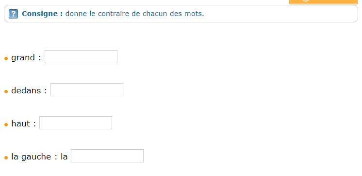Les contraires (antonymes) Exercices Lien direct : https://learningapps.org/view29778 Lien direct : https://learningapps.org/view642657 Lien direct : https://learningapps.org/view10060422 Partager : Partager sur X(ouvre dans une nouvelle fenêtre) X Partager sur Facebook(ouvre dans une nouvelle fenêtre) Facebook Share on LinkedIn(ouvre dans une nouvelle fenêtre) LinkedIn Partager sur WhatsApp(ouvre dans une nouvelle fenêtre) WhatsApp Email a link to a friend(ouvre dans une nouvelle fenêtre) E-mail Imprimer(ouvre dans une nouvelle fenêtre) Imprimer J’aime chargement… Similaire Laisser un commentaire Annuler la réponse. Δ