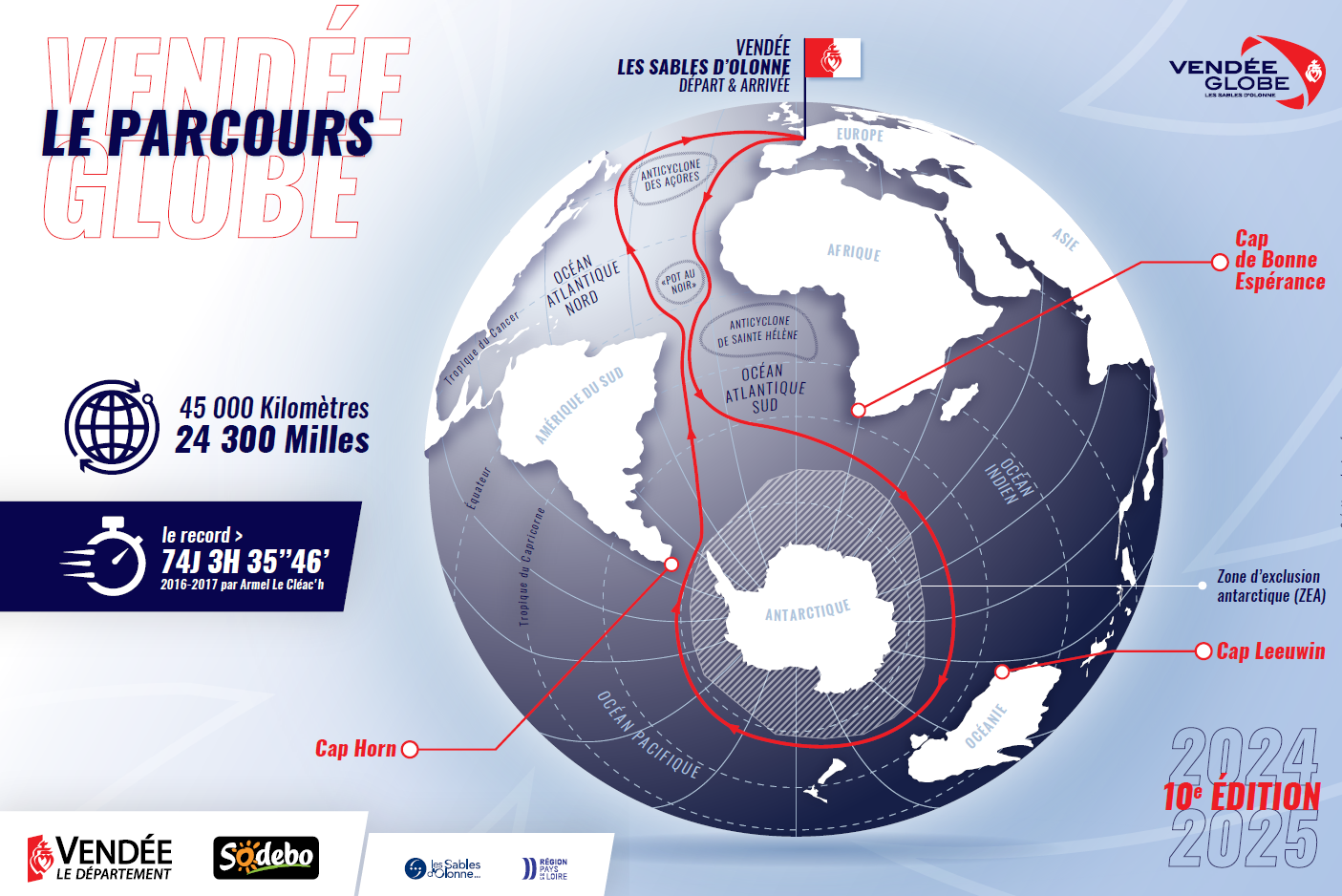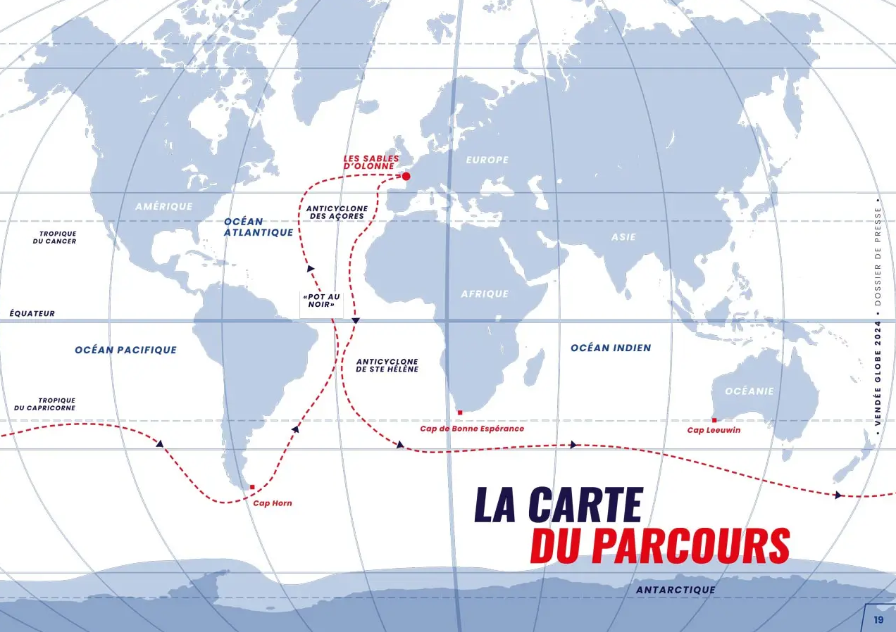 Le départ se fait aux Sables d’Olonne. La course passe par les océans Atlantique, Indien et Pacifique, puis retourne en Vendée. Pour protéger la faune marine (cétacés, requins…), des Zones d’Exclusion Antarctique ont été établies pour éviter les risques de collisions entre les IMOCA et la mégafaune dans ces zones qui sont très importantes pour l’alimentation et la reproduction des animaux marins.